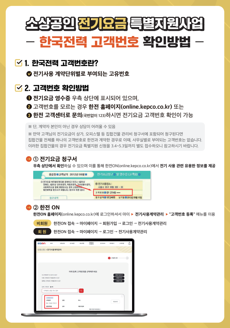 - 온라인 신청: 소상공인 전기요금 특별지원 사이트에서 신청.